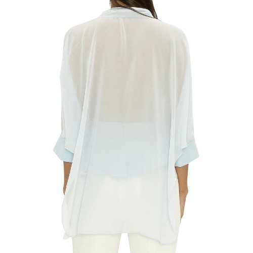 This blouse is everything. Pale blue, floaty fabric, draped back and tie at front. It is sheer.