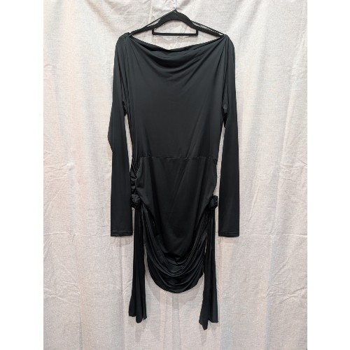 This little black dress is a statement piece. It has a ruched, drape style front with tassel type things and like little flowers. Very cute, very feminine, and very you!